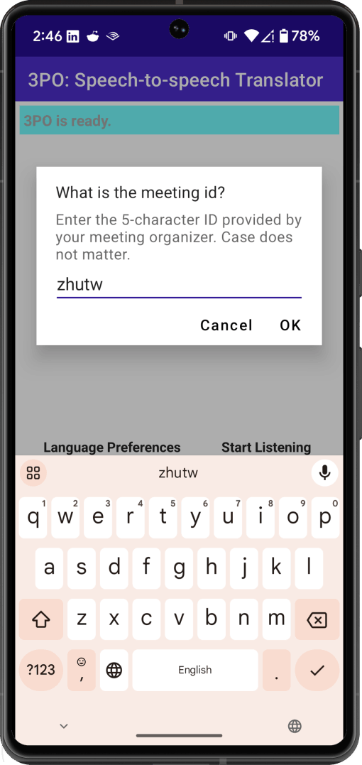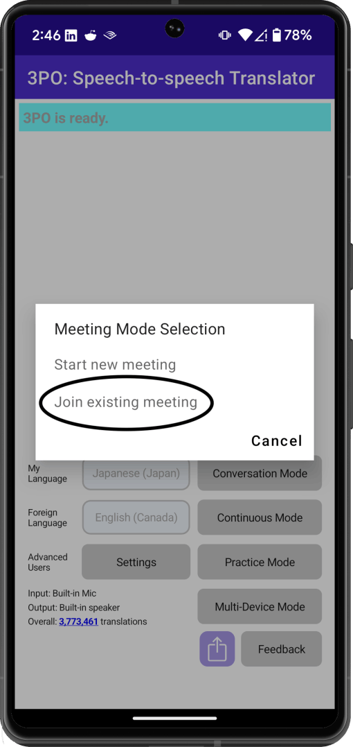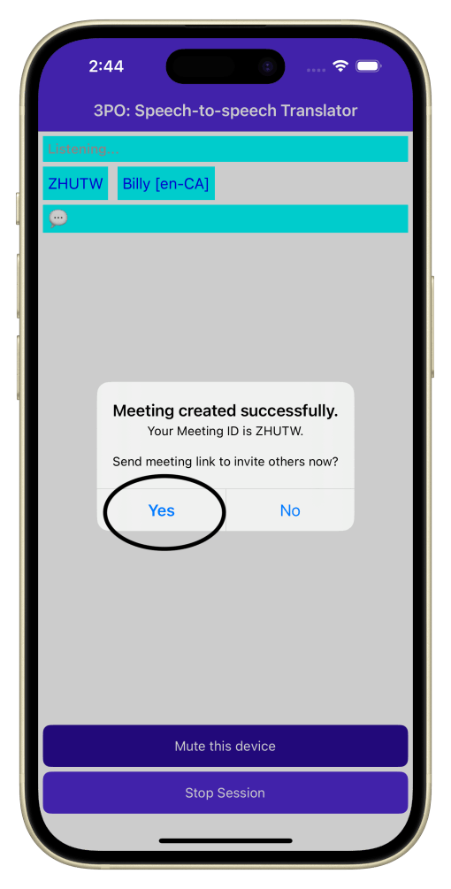 On your friend's phone, tap "Multi-Device Mode" and "Join Existing Meeting" using the 5-character meeting ID above.