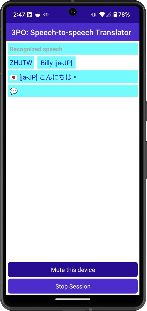 Ask your friend to set up languages on his/her phone in 3PO as well (e.g. Japanese as my language and English as foreign language).