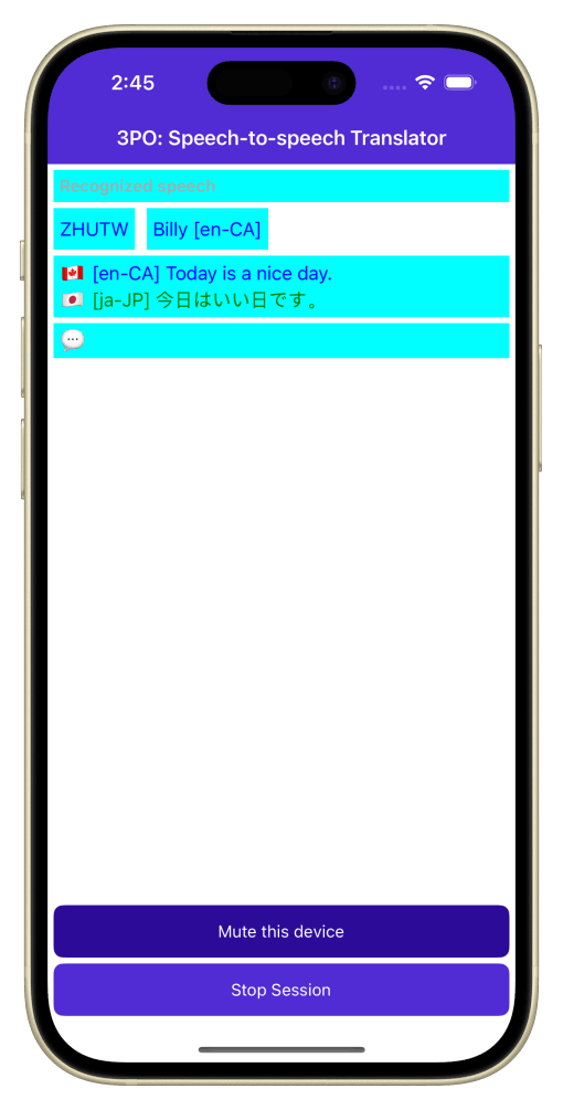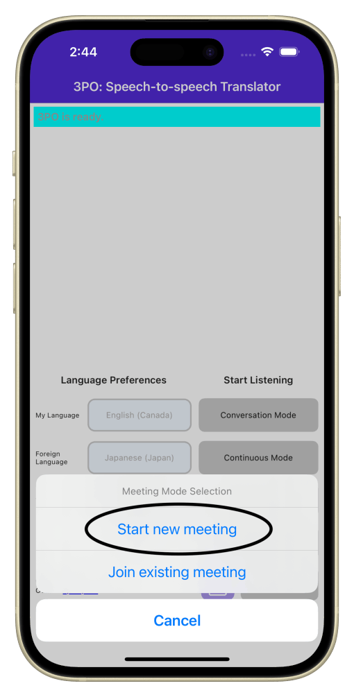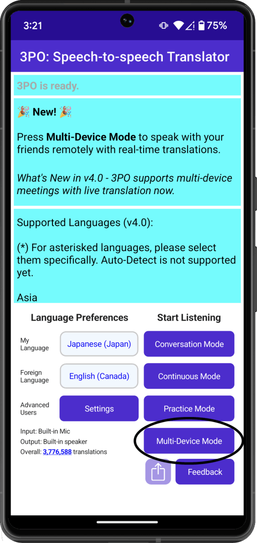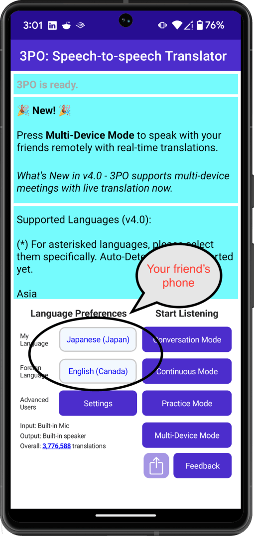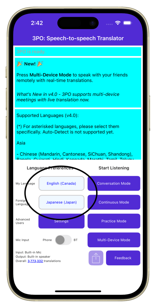 Choose your own language (e.g English) and foreign language (e.g. Japanese) on your 3PO main screen.